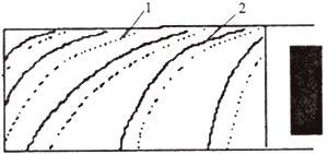 1—實線是正常時瓦斯等濃度線;2—虛線是礦壓顯現(xiàn)瓦斯等濃度線