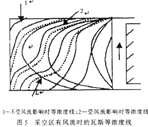 在采空區(qū)內有風流流動時,采空區(qū)內的瓦斯?jié)舛纫?guī)律發(fā)生了變化。如圖5所示。