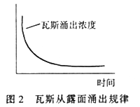 煤層揭露時,煤層揭露面原始的瓦斯存在的平衡條件遭到破壞,煤層揭露面的瓦斯壓力突然降到與揭露處空氣的絕對壓力相等。吸附在揭露面的瓦斯迅速釋放到空氣中去。同時靠近揭露面煤層內的游離狀態(tài)瓦斯通過與外界溝通的煤層裂隙緩慢釋放,煤層瓦斯壓力逐漸降低,該處和瓦斯存在平衡也遭到破壞,吸附狀態(tài)的瓦斯逐漸釋放,同時深部的游離狀態(tài)瓦斯通過孔隙不斷進行補充,達到新的動態(tài)平衡。平衡后的瓦斯壓力比原始煤層的瓦斯壓力?。慌c深部煤層的瓦斯壓力形成壓差,又破壞深部的瓦斯存在平衡。這樣逐步向煤層深部發(fā)展,形成不斷變化的瓦斯壓力梯度;同時釋出的瓦斯流線不斷增長,阻力不斷變大,煤層瓦斯涌出速度與瓦斯釋放阻力成正比。隨著煤層揭露面的時間長,煤層瓦斯涌出量隨時間大致按指數(shù)函數(shù)關系逐漸衰減,如圖2所示。