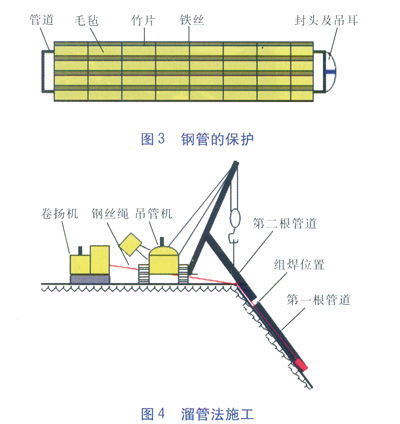在進行鋼管下溝時,一般用柔性物(草袋、毛氈)將管道包裹,外表面用竹片保護,用鐵絲捆扎牢固,管端焊制封頭、吊耳[3](鋼管的保護見圖3)。將鋼絲繩拴在吊耳上,鋼絲繩另一端連接卷揚機。用吊車或吊管機(加長吊桿)直接將第一根管道吊放到管溝內(nèi),用卷揚機牽引著向山底(沖溝)下方移動,緩緩向下溜管,直到第一根管道尾端到達組焊預(yù)定位置(一般為斜坡頂部附近)停止溜管;然后用吊車或吊管機吊裝第二根管道,在組焊預(yù)定位置進行組對焊接作業(yè)。第一、二根鋼管組焊且焊縫冷卻后,在吊管機的配合下,卷揚機牽引著兩根管道緩緩向山坡(沖溝)下方移動,當管道尾端到達組焊預(yù)定位置后,吊車或吊管機吊裝第三根管道,在組焊預(yù)定位置進行組對焊接作業(yè)。依此類推,直至達到要求的敷設(shè)管道長度。通過彎管連接坡頂管道和斜坡管道,坡頂管道敷設(shè)長度宜大于100m,確保斜坡管道在牽引鋼絲繩解開后的穩(wěn)定性。溜管法施工見圖4。