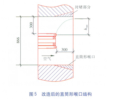 因此,考慮將喇叭形喉口改造成直筒形喉口。直筒形喉口優(yōu)于喇叭形喉口的原因為:直筒形喉口容易制造,而且造價較低。最重要的是,直筒形喉口可縮小火焰直徑,防止兩臺燃燒器之間氣流的強(qiáng)烈碰撞,從而解決火焰沖刷兩側(cè)水冷壁的問題。