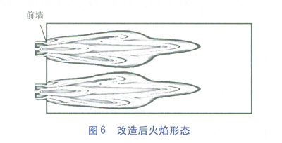 經(jīng)CFD仿真,得到改造后的火焰形態(tài),見圖6。由圖6可知,火焰未沖刷爐膛兩側(cè)水冷壁,火焰直徑、長度合適,與爐膛匹配度好。改造后運(yùn)行滿一年,未再出現(xiàn)爆管現(xiàn)象,燃燒器工作平穩(wěn)。