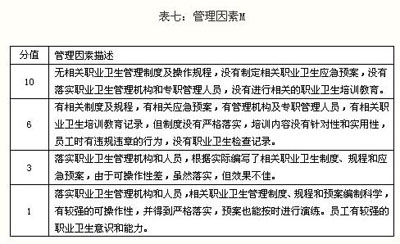 職業(yè)健康危害因素的危害風險大小與職業(yè)危害發(fā)生的可能性L、員工暴露時間E、危害后果嚴重性C相關,還與包括企業(yè)的管理控制水平及員工的安全意識和防范技能的管理因素M有關。