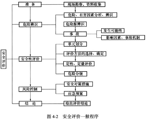 根據(jù)2003年3月31日國(guó)家安全生產(chǎn)監(jiān)督管理局頒布的《安全評(píng)價(jià)通則》,安全評(píng)價(jià)程序一般包括:準(zhǔn)備階段,危險(xiǎn)有害因素辨識(shí)與分析,安全評(píng)價(jià),提出安全對(duì)策措施,形成安全評(píng)價(jià)結(jié)論及建議,編制安全評(píng)價(jià)報(bào)告等,如圖4-2所示。