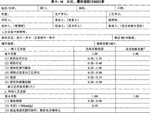 (2)分析、計(jì)算、評(píng)價(jià)需要填寫火災(zāi)、爆炸指數(shù)計(jì)算表(表9—16)、安全措施補(bǔ)償系數(shù)表(表9—17)、工藝單元危險(xiǎn)分析匯總表(表9—18)、生產(chǎn)單元風(fēng)險(xiǎn)分析匯總表(表9—19)。