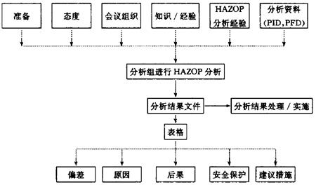 由圖可見,HAZOP分析的整個(gè)過程可分為分析的準(zhǔn)備、實(shí)施分析、編制分析結(jié)果報(bào)告三個(gè)階段。應(yīng)該注意在分析過程中,根據(jù)分析需要分析步驟可交替進(jìn)行,如分析組在完成某個(gè)分析節(jié)點(diǎn)后(不是全部),可將結(jié)果提交給設(shè)計(jì)人員,讓設(shè)計(jì)人員著手對原設(shè)計(jì)進(jìn)行修改。