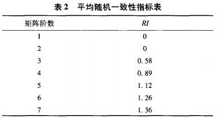 矩陣平均隨機(jī)一致性指標(biāo)RI由表2查得