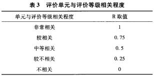 模糊關(guān)系矩陣的建立方法很多,本研究將采用多維量表法來(lái)確定模糊關(guān)系矩陣R0rii的取值如表3所示。