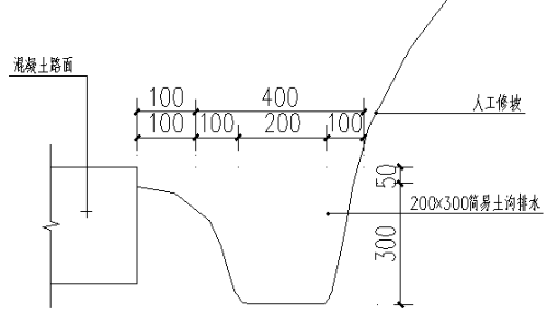 本項(xiàng)目排水采用200×300簡(jiǎn)易土溝排水。本項(xiàng)目交叉口排水溝設(shè)置如下圖所示,本報(bào)告認(rèn)為排水設(shè)施設(shè)計(jì)方案可行。