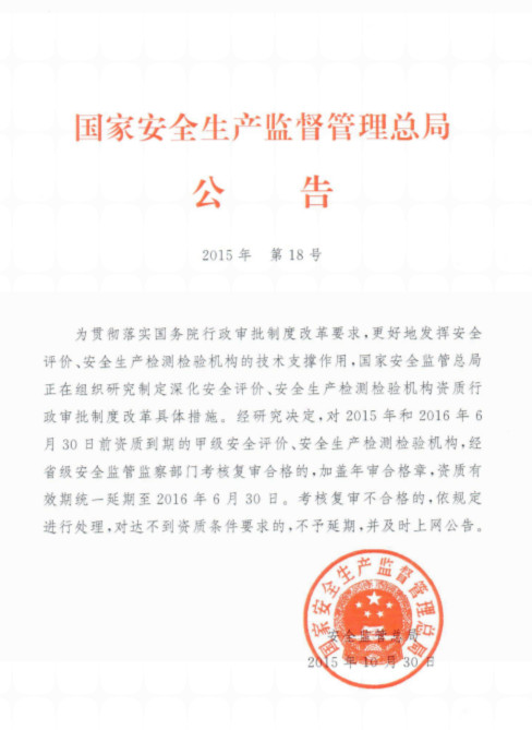 2015年10月30日國家安全生產(chǎn)監(jiān)督管理總局發(fā)布公告(2015年第18號),決定在深化行政審批改革的具體措施落實之前,為保障工作的連續(xù)性,對于部分資質(zhì)有效期到期的安全評價機(jī)構(gòu)予以延期。