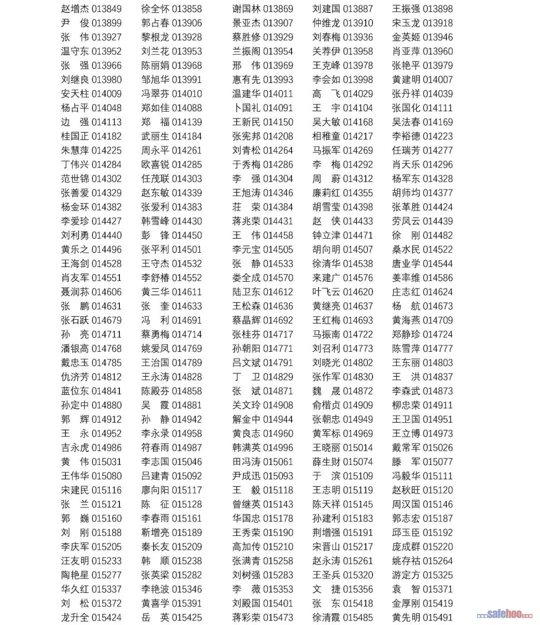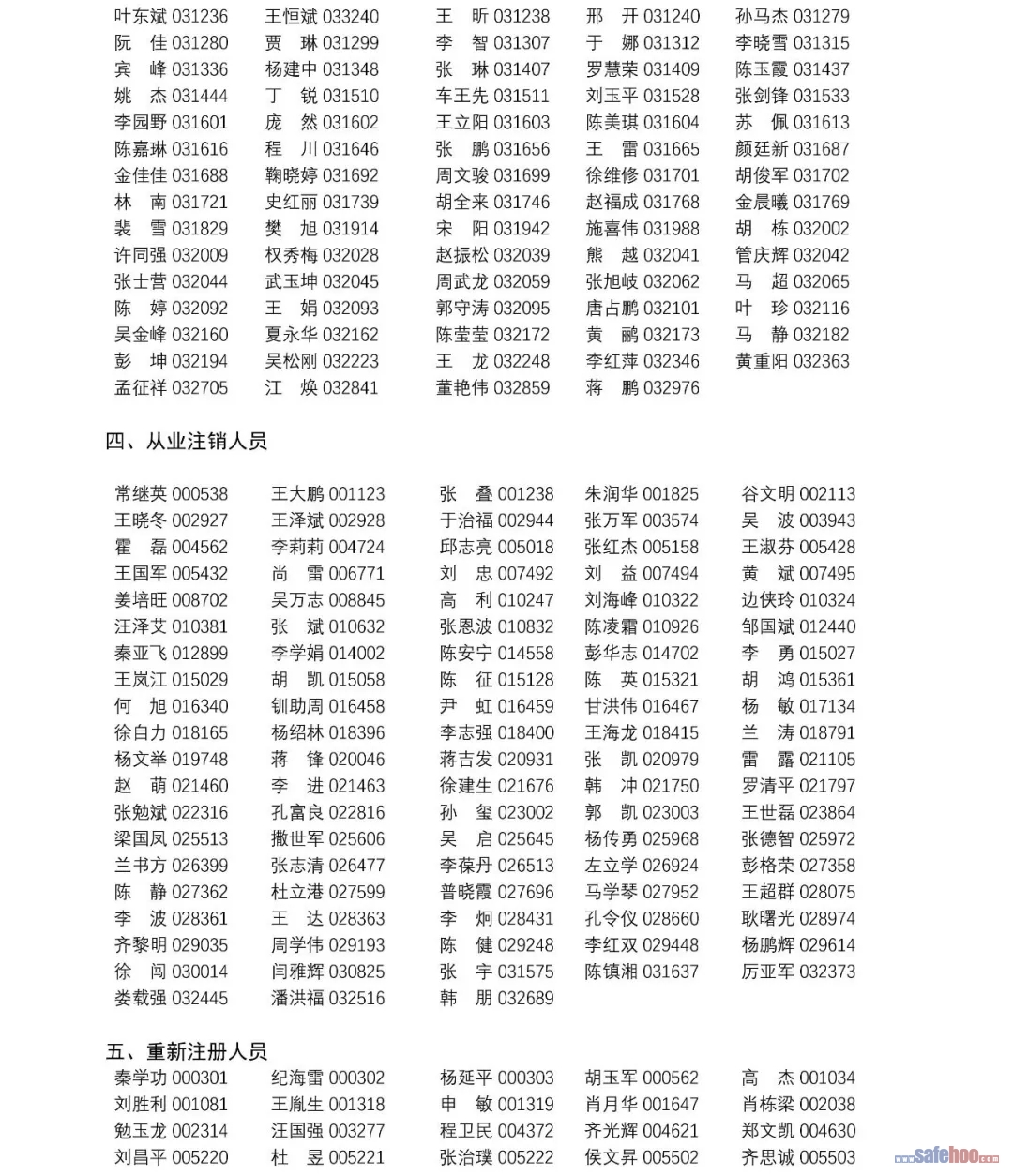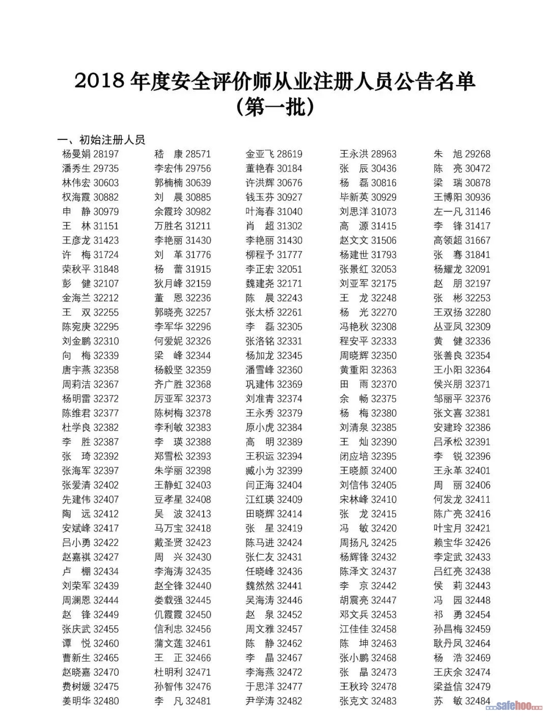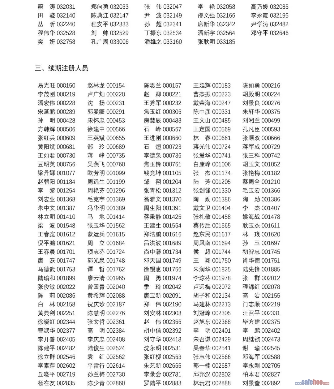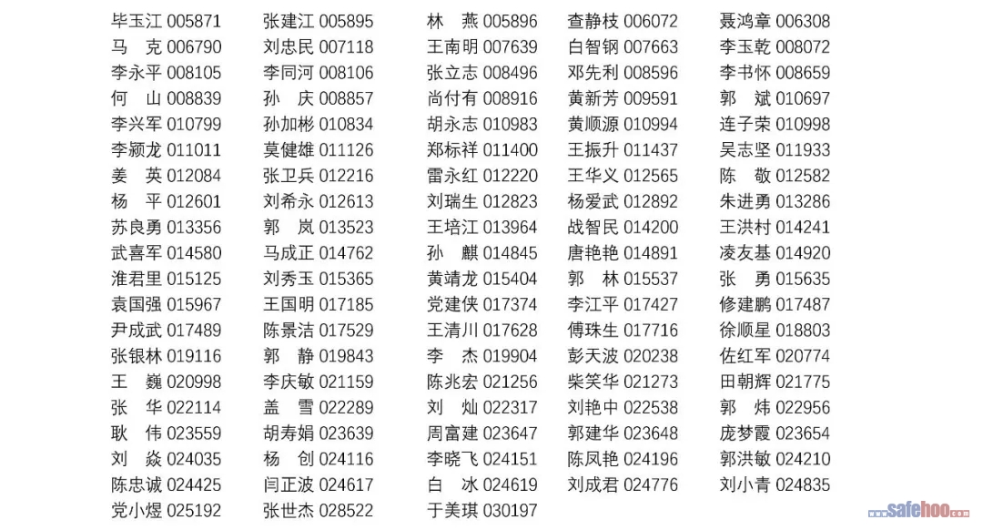 以上公告信息為安全評價師從業(yè)注冊人員姓名+從業(yè)編號,可在中國安全生產(chǎn)協(xié)會網(wǎng)站安全評價師信息查詢欄目中查詢(http://cydj.5anquan.com/UILogin/BeforeUserInfoSearch)。