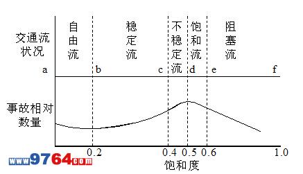 ??????? A點(diǎn)表示交通量很小,駕駛員基本上不受同向行駛車輛的干擾 ;Ab段點(diǎn)表示交通量增加,必須同時考慮與其它車輛的關(guān)系 ;Bc段表示超車比較困難,與超車有關(guān)的事故有所增加 ;Cd段表示超車危險越來越大;De段表示車輛間距已大大減小,不能夠超車;Ef段表示車輛只能尾隨前車緩慢行駛,產(chǎn)生交通阻塞,交通事故大為減少。