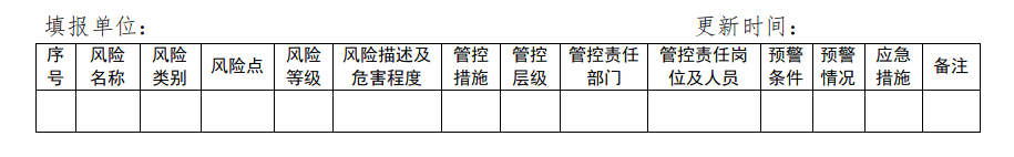 鐵路單位結(jié)合實(shí)際建立本單位統(tǒng)一的風(fēng)險(xiǎn)庫,主要包括風(fēng)險(xiǎn)名稱、風(fēng)險(xiǎn)類別、風(fēng)險(xiǎn)點(diǎn)、風(fēng)險(xiǎn)等級(jí)、風(fēng)險(xiǎn)描述及危害程度、管控措施、管控層級(jí)及部門、管控崗位及責(zé)任人等內(nèi)容。?