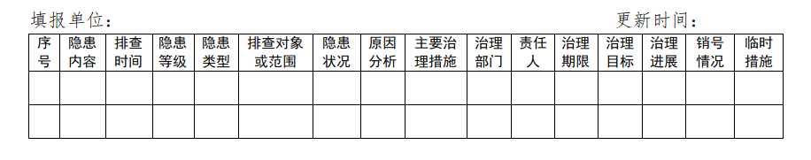 隱患數(shù)據(jù)庫應(yīng)當(dāng)包括隱患內(nèi)容、排查時(shí)間、隱患等級(jí)、治理措施、治理部門和責(zé)任人、治理期限、銷號(hào)情況等內(nèi)容,其中,重大隱患數(shù)據(jù)庫還應(yīng)當(dāng)包括排查部門、隱患類型、排查對(duì)象或范圍、隱患狀況、原因分析、主要治理措施、治理目標(biāo)、治理進(jìn)展、臨時(shí)措施等內(nèi)容。?