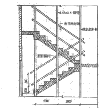??? ② 在陽臺臨邊,離陽臺底部設(shè)橫桿500mm,上部設(shè)橫桿間距600mm,用密目網(wǎng)封嚴(yán)。