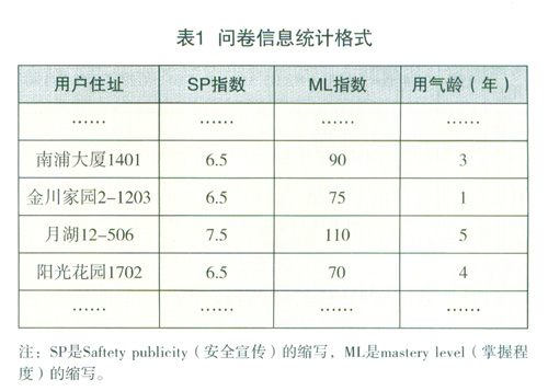 問卷打分采取手工模式,問卷數(shù)據(jù)記錄及統(tǒng)計(jì)采用Microsoft Excel,運(yùn)用軟件中的批量求和程序?qū)?shù)據(jù)進(jìn)行簡單處理,得出每一個(gè)用戶用于表征“燃?xì)獍踩麄鲝?qiáng)度”及“燃?xì)庵R(shí)掌握狀況”的參數(shù)。統(tǒng)汁格式如表1所示:
