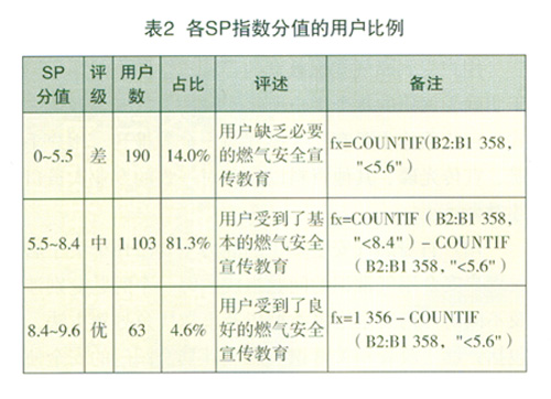 采用countif(range,criteria)統(tǒng)計(jì)程序,按燃?xì)庵R(shí)教育強(qiáng)度(SP)評(píng)級(jí),對(duì)有效問卷的l 357位用戶進(jìn)行分類統(tǒng)計(jì)得出表2統(tǒng)計(jì)結(jié)果: