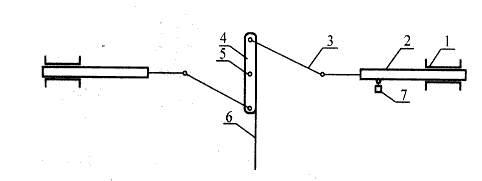 3)安裝手動防墜落裝置。吊籠停層后,工人在吊籠內(nèi)裝卸物品時,吊籠承受載荷最大,并產(chǎn)生晃動沖擊力,易導致鋼絲繩破斷、制動器失靈及別的部件損壞,造成吊籠墜落。為了增加保險系數(shù),建議加設一道手動停層防墜落裝置(見圖3)。該裝置安裝到吊籠頂部內(nèi)側,轉臂4通過鉸支點5固定的吊籠頂部。拉桿3一端與轉臂4鉸接,另一端與銷杠2鉸接,圖示位置吊籠處于運行狀態(tài)。當?shù)趸\停層后,裝卸貨物時,將手柄6順時針搬動,轉臂4帶動拉桿3推動銷杠2套筒1外伸,卡在支架腹桿上,托住吊籠,起防墜落作用。為了防止操作人員失誤,忘記抽回銷杠,另設置觸碰開關7。當銷杠外伸時,觸動開關7斷開動力只有抽回銷杠,開關復位,接通電源,升降機才能運行,以防止誤操作拉斷鋼絲繩或損壞設備部件。