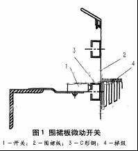 圖1所示,是一種裝在圍裙板之后的安全保護微動開關(guān)。自動扶梯正常工作時,圍裙板2與梯級4間保持一定間隙,單邊不大于4mm,兩邊之和不大于7mm。為保證乘客的安全,在圍裙板的背面安裝c形鋼,離c形鋼一定距離處設(shè)置開關(guān),當異物進人圍裙板與梯級之間的縫隙后,圍裙板發(fā)生變形,c形鋼也隨之移動,達到一定位置后,碰擊開關(guān)1,自動扶梯立即停止運行。