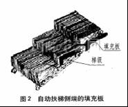 圖2所示,是在梯級兩側(cè)各裝一塊由塑料及干潤滑劑配制而成的填充板,其形狀與梯級相匹配。填充板由彈簧或拉桿保持其位置,并在自動扶梯的全行程范圍內(nèi)與圍裙板相接觸,填滿了自動扶梯圍裙板與梯級兩側(cè)之間的間隙,其安全保護(hù)作用是明顯的。