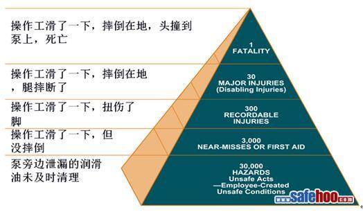 經(jīng)過(guò)大量數(shù)據(jù)統(tǒng)計(jì)表明:死亡事故︰受傷損工︰傷害事件︰危險(xiǎn)事件︰不安全行為的比例是1︰30︰300︰3000︰30000。 事故金字塔理論揭示了一個(gè)十分重要的事故預(yù)防原則:要預(yù)防死亡事故,必須預(yù)防受傷損工事故;要預(yù)防受傷損工事故,必須預(yù)防傷害事件;要預(yù)防傷害事件,必須預(yù)防預(yù)防危險(xiǎn)事件;要預(yù)防危險(xiǎn)事件,必須消除人的不安全行為和物的不安全狀態(tài)。能否及時(shí)消除日常人的不安全行為和物的不安全狀態(tài),取決于日常管理是否到位,也就是平時(shí)講的細(xì)節(jié)管理,這是預(yù)防死亡和重傷事故的最重要基礎(chǔ)工作我們要從細(xì)節(jié)管理著手,抓好日常安全管理工作,降低“安全金字塔”底部的不安全行為和不安全狀態(tài),預(yù)防死亡和重傷事故,實(shí)現(xiàn)全員安全。