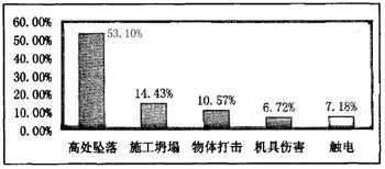 2004年,全國(guó)建筑施工傷亡事故類別仍主要是高處墜落、施工坍塌、物體打擊、機(jī)具傷害和觸電等類型,總計(jì)占全部事故死亡人數(shù)的92.00%,它們具體分布見圖1.2。