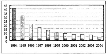 圖1.1? 1994-2004年我國(guó)建筑業(yè)安全生產(chǎn)百億元產(chǎn)值死亡率