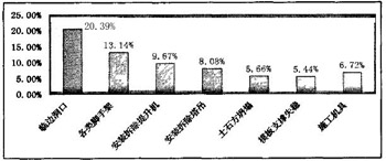 2004年,事故主要發(fā)生在臨邊洞口處作業(yè),在各類腳手架上作業(yè),安裝、拆除龍門架(井字架)物料提升機(jī),安裝、拆除塔吊,土石方坍塌事故,因模板支撐失穩(wěn)倒塌,施工機(jī)具。它們具體的分布見圖1.3。