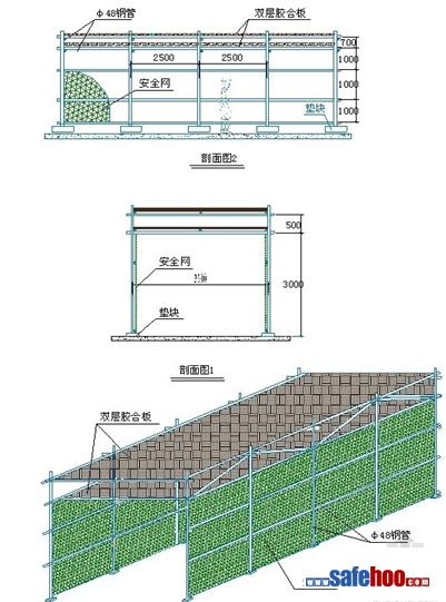 現(xiàn)場安全通道包括外架斜道、施工現(xiàn)場參觀通道、施工機械入口處安全防護(hù)棚、廠房入口處安全防護(hù)棚等。參觀通道、施工安全通道等用鋼管搭設(shè),兩側(cè)用安全網(wǎng)密封,上部用多層膠合板覆蓋,設(shè)置兩層,間距≥500mm。
