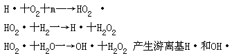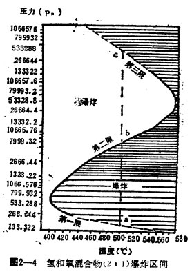 圖中a和b點(diǎn)時(shí)的壓力,即200Pa和6666Pa是混合物在500℃時(shí)的爆炸低限和爆炸高限。隨著溫度增加,爆炸極限會變寬。這是由于鏈反應(yīng)需要有一定的活化能,鏈分支反應(yīng)速度隨溫度升高而增加,而鏈終止的反應(yīng)卻隨溫度的升高而降低,故升高溫度對產(chǎn)生鏈反應(yīng)有利,結(jié)果使爆炸極限變寬,在圖上呈現(xiàn)半島型。當(dāng)壓力再升高超過c點(diǎn)(大于666610Pa)時(shí),開始出現(xiàn)下列反應(yīng):