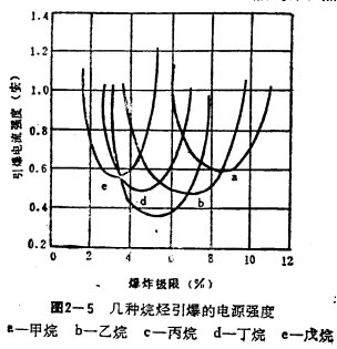 對于每一種可燃?xì)怏w(蒸氣)的爆炸性混合物,都有一個(gè)引起爆炸的最小點(diǎn)火能量,低于該能量,混合物就不爆炸。從圖2—5可以看出,引起烷烴爆炸的電火花的最小電流強(qiáng)度分別為:甲烷0.57A,乙烷0.45A,丙烷0.36A,丁烷0,48A,戊烷0.55A。