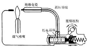 (1)壓電陶瓷點火裝置 給一種晶體(亦稱“壓電陶瓷”)施加一定的壓力就會放電,這種放電現(xiàn)象就叫“壓電”。如圖3—10—3所示,借外力使壓電陶瓷Ⅰ與Ⅱ相沖擊,將機械能轉(zhuǎn)變?yōu)殡娔?,輸?~18kV高壓,擊穿電極間隙4~6mm、產(chǎn)生電火花,并用以點燃燃?xì)狻?br />