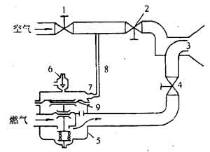 這種調(diào)節(jié)裝置能保持燃燒器前燃?xì)夂涂諝鈮毫Ρ戎狄欢ǎ瑥亩谷細(xì)馀c空氣量按一定比例混合。其工作原理如下:當(dāng)閥門1關(guān)小,空氣量減少,閥l后壓力降低,通過脈沖管8經(jīng)噴嘴7使薄膜上空間壓力也降低。燃?xì)庹{(diào)壓器的閥芯上升,燃?xì)饬侩S之減少,從而使兩者按調(diào)定比例混合。確定氣量比例的平衡壓力是靠節(jié)流裝置6來實(shí)現(xiàn)的。燃燒器生產(chǎn)率過完全取決于空氣壓力的變化。