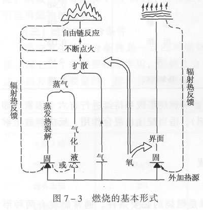不論是有焰燃燒還是無焰燃燒,燃燒過程十分復(fù)雜,其維持燃燒的基本形式,如圖7—3所示。固體可燃物經(jīng)高溫分解產(chǎn)生氣體、可燃液體的蒸氣和可燃氣體燃燒時,出現(xiàn)火焰是有焰燃燒。有些固體,如焦炭、木炭等,它由固態(tài)的碳直接參與氧化反應(yīng),這種燃燒是不出現(xiàn)火焰的表面燃燒,是無焰燃燒。有的固體,如煤、木材等,燃燒開始為有焰燃燒,之后繼續(xù)進行無焰燃燒。