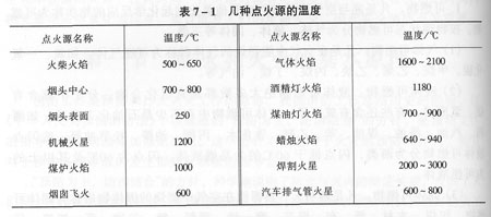 在油庫加油站中常見的造成火災(zāi)危害的點火源主要有明火、高溫表面、電熱能、機械熱能等。表7—1列出了幾種點火源的溫度。點火源的溫度越高,越易引起可燃物的燃燒。