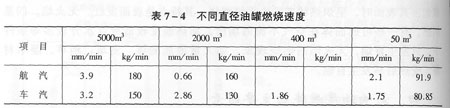 4.儲罐直徑??扇嘉锖鸵兹家后w儲罐直徑對液體物質(zhì)燃燒速度影響很大?!闶请S儲油罐直徑增大,燃燒速度加快。消防科研單位試驗數(shù)據(jù)見表7—4。