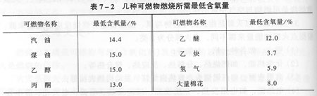 2.一定的含氧量。雖有氧氣存在,但濃度不夠,含量低,燃燒或爆炸也不會發(fā)生。幾種可燃物燃燒所需最低含氧量見表7—2。