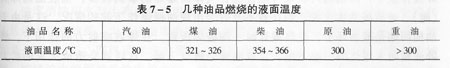 (1)油品燃燒的液面溫度。油晶燃燒有大量的輻射熱產(chǎn)生,對油品表面不斷加熱,油品液面溫度升高,揮發(fā)增強。油品揮發(fā)吸收大量的氣化熱,當(dāng)輻射加熱與氣化吸熱達到熱平衡時,油品液面溫度達最大值。輕質(zhì)油品揮發(fā)強,吸熱多,液面溫度較低;重質(zhì)油晶揮發(fā)小,吸收熱量少,液面溫度較高。表7—5是幾種油品燃燒的液面溫度。
