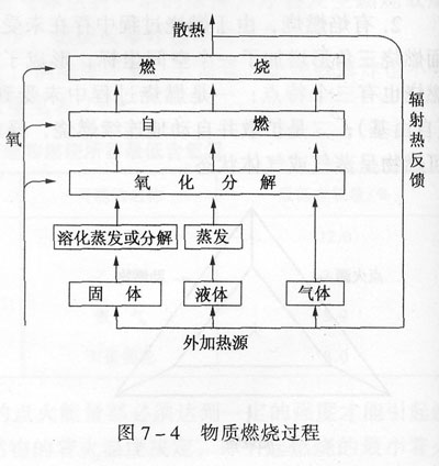 在可燃氣體、液體、固體物質(zhì)的燃燒中,其燃燒速度,氣體最快,液體次之,固體較慢。它們的燃燒過程如圖7—4所示。