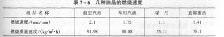 (2)油品燃燒的速度。油品燃燒速度受油罐直徑、風(fēng)力、氣溫等的影響。輕質(zhì)油品其速度基本一定,原油、重油的燃燒速度先快后慢。表7—6是幾種油品燃燒速度的參考數(shù)據(jù)。含水油品(原油、重油)若含水量超過8%時,油品呈乳化狀,不燃燒;含水量4%—8%時,燃燒不穩(wěn)定,含水量小于4%時,燃燒穩(wěn)定。