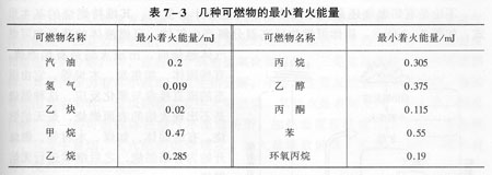 3.一定的點火能量。任何形式的點火能量都必須達到一定的強度才能引起燃燒或爆炸。所需點火能量強度由可燃物的著火溫度決定,即引起燃燒的最小著火能量。著火溫度還受含氧濃度、空氣溫度、暴露時間、容器大小和形狀等因素的影響。幾種可燃物的最小著火能量見表7—30。