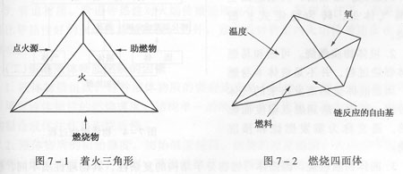 2.有焰燃燒,由于燃燒過程中存在未受抑制的游離基(自由基)作中間體,因而燃燒三角形增加了一個空間坐標,形成了燃燒四面體,如圖7—2所示。有焰燃燒也有三個特點:一是燃燒過程中未受到抑制,形成連鎖反應(yīng),存在游離基(自由基);二是擴散并自動地連續(xù)燃燒,釋放能量,達到有焰燃燒的溫度;三是可燃物呈蒸氣或氣體狀態(tài)。