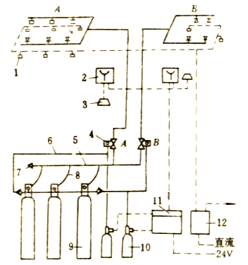 1— 探測(cè)器;2—手動(dòng)按鈕起動(dòng)裝置;3—報(bào)警器;4—選擇閥;5—總管;6—操作管;7—安全閥;8—連接管;9—儲(chǔ)存容器;10—起動(dòng)用氣容器;11—報(bào)警控制裝置;12—檢測(cè)盤(pán)