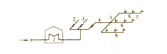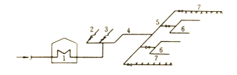 1— 蒸汽鍋爐房;2—生活蒸汽管線;3—生產(chǎn)蒸汽管線;4—輸氣干管;5—配氣支管;6—配氣管;7—蒸汽幕