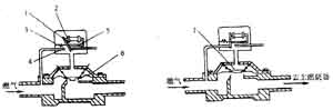2.電磁閥控制的預防空氣中斷的安全裝置(圖3—10—18)它能預防電流中斷引起的事故。當電流中斷時,電磁閥切斷燃氣;若電流恢復,電磁閥重新開啟,讓燃氣通過。它的作用與鼓風機的風量及風壓無關。