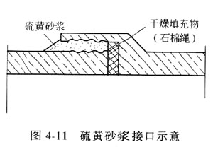 ②硫黃砂漿接口 硫黃砂漿接口示意如圖4—11所示。材料配比見(jiàn)表4—24。