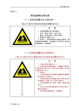 附件1: 危險廢物標志牌式樣 A-1危險廢物警告標志牌式樣一 (適合于室內外懸掛的危險廢物警告標志) 說 明 1、危險廢物警告標志規(guī)格顏色 形狀:等邊三角形,邊長40cm 顏色:背景為黃色,圖形為黑色 2、警告標志外檐2.5cm 3、使用于:危險廢物貯存設施為房屋的,建有圍墻或防護柵欄,且高度高于100CM時;部分危險廢物利用、處置場所。 A-2危險廢物警告標志牌式樣二 (適合于室內外獨立擺放或樹立的危險廢物警告標志) 說 明 1、主標識要求同附件A-1。 2、主標識背面以螺絲固定,以調整支桿高度,支桿底部可以埋于地下,也可以獨立擺放,標志牌下沿距地面120cm。 4、使用于: ⑴危險廢物貯存設施建有圍墻或防護柵欄的高度不足100CM時; ⑵危險廢物貯存設施其它箱、柜等獨立貯存設施的,其箱、柜上不便于懸掛時; ⑶危險廢物貯存于庫房一隅的,需獨立擺放時; ⑷所產生的危險廢物密封不外排存放的,需獨立擺放時; ⑸部分危險廢物利用、處置場所。 B-1危險廢物標簽式樣一 (適合于室內外懸掛的危險廢物標簽) 說 明 1、危險廢物標簽尺寸顏色 尺 寸:40×40cm 底 色:醒目的橘黃色 字 體:黑體字 字體顏色:黑色 2、危險類別:按危險廢物種類選擇。 3、使用于:危險廢物貯存設施為房屋的;或建有圍墻或防護柵欄,且高度高于100CM時; B-2危險廢物標簽式樣二 (適合于室內外獨立樹立或擺放的危險廢物標簽) 說 明 1、危險廢物警告標志要求同附件A-1。 2、危險廢物標簽要求同附件B-1。 3、支桿距地面120cm。 4、使用于: ⑴危險廢物貯存設施建有圍墻或防護柵欄的高度不足100CM時; ⑵危險廢物貯存設施其它箱、柜等獨立貯存設施的,其箱、柜上不便于懸掛時; ⑶危險廢物貯存于庫房一隅的,需獨立擺放時; ⑷所產生的危險廢物密封不外排存放的,需獨立擺放時。 B-3危險廢物標簽式樣三 (粘貼于危險廢物儲存容器上的危險廢物標簽) 說 明 1、危險廢物標簽尺寸顏色 尺 寸:20×20cm 底 色:醒目的橘黃色 字 體:黑體字 字體顏色:黑色 2、危險類別:按危險廢物種類選擇。 3、材料為不干膠印刷品。 B-4危險廢物標簽式樣四 (系掛于袋裝危險廢物包裝物上的危險廢物標簽) 說 明 1、危險廢物標簽尺寸顏色 尺 寸:10×10cm 底 色:醒目的橘黃色 字 體:黑體字 字體顏色:黑色 2、危險類別:按危險廢物種類選擇。 3、材料為印刷品。 B-5一些危險廢物的危險分類 廢 物 種 類 危 險 分 類 廢酸類 刺激性/腐蝕性(視其強度而定) 廢堿類 刺激性/腐蝕性(視其強度而定) 廢溶劑如乙醇、甲苯 易燃 鹵化溶劑 有毒 油—水混合物 有害 氰化物溶液 有毒 酸及重金屬混合物 有害/刺激性 重金屬 有害 含六價鉻的溶液 刺激性 石棉 石棉 B-6危險廢物種類 危險分類 符號 危險分類 符號 Explopsive 爆炸性 Toxic 有毒 Flammable 易燃 Harmful 有害 Oxidizing 助燃 Corrosive 腐蝕性 Irritant 刺激性 Asbestos 石棉 C-1醫(yī)療廢物警示標志式樣一 (適用于醫(yī)療廢物暫存、處置場所的醫(yī)療廢物警示標志) 說 明 1、形狀:等邊三角形 2、顏色:背景色為黃色 文字和字母為黑色 邊框和主標識為黑色 3、尺寸:警示牌 等邊三角形邊長400mm 主標識 高150mm 中文文字 高40mm 英文文字 高40mm 4、適用于:醫(yī)院醫(yī)療廢物暫存間、醫(yī)療廢物處置中心醫(yī)療廢物暫存間或醫(yī)療廢物處置設施。 C-2醫(yī)療廢物警示標志式樣二 (適用于醫(yī)院科室醫(yī)療廢物收集點的醫(yī)療廢物警示標志) 說 明 1、主標識形狀、顏色同附件C-1。 2、尺寸:警示牌 等邊三角形邊長200mm 主標識 高75mm 中文文字 高20mm 英文文字 高20mm 3、適用于:適用于醫(yī)院科室醫(yī)療廢物收集點。 C-3醫(yī)療廢物轉運車警示標志 說 明 1、形狀:菱形形 2、顏色:背景色 醒目的橘紅色 文字和字母 黑色 邊框和主標識 黑色 3、尺寸:警示牌 邊長400mm 主標識 高150mm 中文文字 高40mm 英文文字 高40mm D 醫(yī)療廢物專用包裝物警示標志 標志顏色 菱形邊框 黑色 背景色 淡黃(GB/T3181 中的Y06) 中英文文字 黑色 標志規(guī)格 包裝袋 感染性標志 高度最小5.0cm 中文文字 高度最小1.0cm 英文文字 高度最小0.6cm 警示標志 最小12.0cm×12.0cm 利器盒 感染性標志 高度最小2.5cm 中文文字 高度最小0.5cm 英文文字 高度最小0.3cm 警示標志 最小6.0cm×6.0cm 周轉箱(桶) 感染性標志 高度最小10.0cm 中文文字 高度最小2.5cm 英文文字 高度最小1.65cm 警示標志 最小20.0cm×20.0cm 注:1、帶有警告語的警示標志的底色為包裝袋和容器的背景色,邊框和警告語的顏色均為黑色,長寬比為2:1,其中寬度與警示標志的高度相同。 2、警告語依據《醫(yī)療廢物分類目錄》確定,如感染性廢物、損傷性廢物等。 3、警示標志和警告語的印刷質量要求油墨均勻;圖案、文字清晰、完整;套印準確,套印誤差應不大于1mm。 附件2: 危險廢物標志牌申領表 單位(蓋章): 編號 數 量 備 注 A-1 A-2 B-1 爆炸性 易 燃 助 燃 刺激性 有 毒 有 害 腐蝕性 石 棉 B-2 爆炸性 易 燃 助 燃 刺激性 有 毒 有 害 腐蝕性 石 棉 B-3 爆炸性 易 燃 助 燃 刺激性 有 毒 有 害 腐蝕性 石 棉 B-4 爆炸性 易 燃 助 燃 刺激性 有 毒 有 害 腐蝕性 石 棉 C-1 C-2