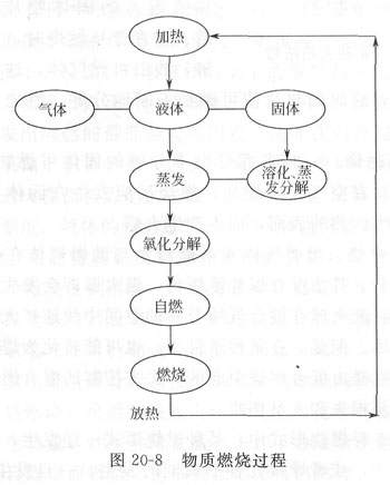 ?、偃紵^(guò)程? 大多數(shù)可燃物質(zhì)的燃燒是在蒸氣或氣態(tài)下進(jìn)行的。由于可燃物質(zhì)的聚集狀態(tài)不同,其受熱所發(fā)生的燃燒過(guò)程也不同。氣體最容易燃燒,其燃燒所需的熱量只用于本身的氧化分解,并使其達(dá)到自燃點(diǎn)而燃燒。液體在熱源作用下,首先蒸發(fā)成蒸氣,然后蒸氣被氧化、分解,然后在氣相中著火燃燒。固體的燃燒,如果呈硫、磷、萘等單質(zhì),它們首先受熱熔化或升華,然后蒸發(fā)生蒸氣,氧化分解后著火燃燒。如果是復(fù)雜的化合物,在受熱時(shí)首先分解,然后氣態(tài)產(chǎn)物和液態(tài)產(chǎn)物的蒸氣發(fā)生氧化后著火燃燒。燃燒時(shí)放出的熱量又會(huì)使可燃物繼續(xù)溶化,分解、蒸發(fā)、氧化、著火、燃燒,只有助燃物源源不斷地供給,燃燒就一直進(jìn)行到燃物燒完為止。各種狀態(tài)可燃物質(zhì)的燃燒過(guò)程如圖20—8所示。