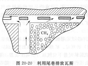 b. 回采工作面?;夭晒ぷ髅娴耐咚怪饕菀追e聚在工作面上隅角。處理上隅角積聚瓦斯的方法很多。如圖20—20是利用尾巷排放瓦斯。