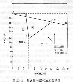 b.氧濃度的影響。實(shí)驗(yàn)證明,瓦斯爆炸界限隨混合氣體中氧的濃度降低而縮小。當(dāng)氧的濃度降低時(shí),瓦斯爆炸下限緩慢增多,爆炸上限則迅速下降。當(dāng)氧濃度降低到12%時(shí),瓦斯?昆合氣體遇火也不會爆炸。如圖20—19所示。圖中甲區(qū)實(shí)際上是不可能出現(xiàn)的區(qū);乙區(qū)是瓦斯含量較少,自己不能燃燒,但可以助長已有的火焰;丙區(qū)是引火就爆炸區(qū)域;丁區(qū)是瓦斯過多,氧氣不足區(qū)域。這正像井下密閉中的混合氣體,一旦打開密閉,混入空氣則氧氣增加,瓦斯含量減少,因此,必定經(jīng)過丙爆炸區(qū),所以是危險(xiǎn)的,必須慎重處理。
